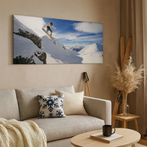 La tela "Snowboarder che salta da una scogliera con montagne innevate sullo sfondo" raffigura uno snowboarder in azione, che salta da una scogliera con sullo sfondo pittoresche montagne innevate. La scena, ricca di dinamismo ed emozione, sottolinea la passione per gli sport estremi e le avventure nei paesaggi montani.