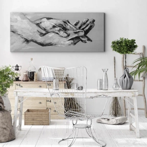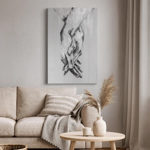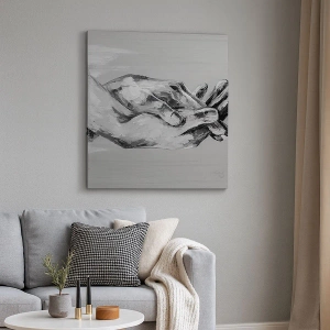• Il dipinto presenta una composizione in bianco e nero di due mani giunte su uno sfondo chiaro. Questa decorazione discreta e minimalista è perfetta per un soggiorno, una camera da letto o un ufficio.