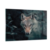 Quadro su vetro - Un lupo osserva vigile dal suo nascondiglio nel folto della foresta - 120x80cm - Cacciatore - Decorazione murale moderna per soggiorno e camera da letto ARTTOR