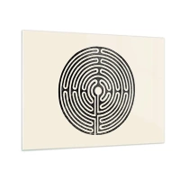 Quadro su vetro - Un labirinto bianco e nero di forma circolare su uno sfondo chiaro. - 70x50cm - Ordine misterioso - Decorazione murale moderna per soggiorno e camera da letto ARTTOR