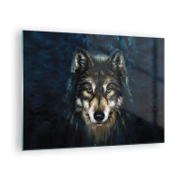 Quadro su vetro - Un lupo su uno sfondo scuro, come una foresta, in stile realistico. - 70x50cm - Alfa? E omega - Decorazione murale moderna per soggiorno e camera da letto ARTTOR