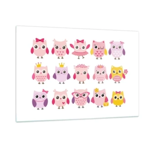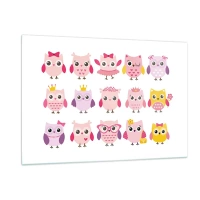Quadro su vetro - Gufi colorati in vari motivi su uno sfondo bianco - 120x80cm - Una più dolce dell'altra - Decorazione murale moderna per soggiorno e camera da letto ARTTOR