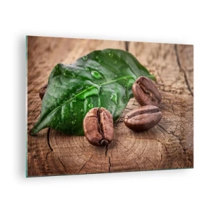 Quadro su vetro - Chicchi di caffè su uno sfondo di foglie e legno - 70x50cm - Nero e autentico - Decorazione murale moderna per soggiorno e camera da letto ARTTOR