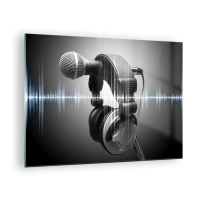 Quadro su vetro - Microfono con cuffie su uno sfondo di onde sonore - 70x50cm - Si sente ancora il canto - Decorazione murale moderna per soggiorno e camera da letto ARTTOR