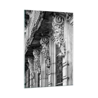 Quadro su vetro - Pennellate dinamiche in bianco e nero su sfondo beige. - 50x70cm - Composizione: alla ricerca della pienezza - Decorazione murale moderna per soggiorno e camera da letto ARTTOR