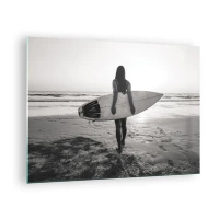 Quadro su vetro - Donna con una tavola da surf sulla spiaggia all'alba - 70x50cm - La figlia dell'onda marina - Decorazione murale moderna per soggiorno e camera da letto ARTTOR