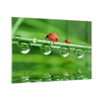 Quadro su vetro - Coccinelle su un filo d'erba con gocce di rugiada e riflesso nell'acqua - 100x70cm - In cammino per tutta l'estate - Decorazione murale moderna per soggiorno e camera da letto ARTTOR