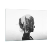 Quadro su vetro - Una donna in bianco e nero con un motivo di foresta di conifere sovrapposto - 120x80cm - La signora della pineta - Decorazione murale moderna per soggiorno e camera da letto ARTTOR