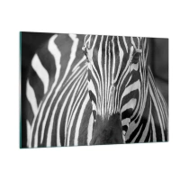 Quadro su vetro - Ritratto in bianco e nero di una zebra con strisce visibili - 120x80cm - Il mondo è in bianco e nero - Decorazione murale moderna per soggiorno e camera da letto ARTTOR