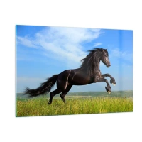 Quadro su vetro - Un cavallo nero al galoppo contro un cielo azzurro e un prato verde. - 120x80cm - Coinvolgente manifesto di libertà - Decorazione murale moderna per soggiorno e camera da letto ARTTOR