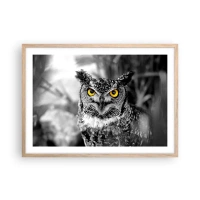 Quadro su vetro - Uno scatto in bianco e nero di un gufo con gli occhi gialli - 70x100cm - Non si può nascondere niente - Decorazione murale moderna per soggiorno e camera da letto ARTTOR