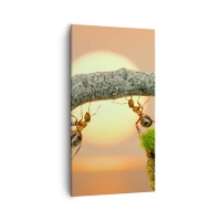 Quadro su vetro - Formiche che costruiscono un ponte di rami sullo sfondo del sole al tramonto. - 70x100cm - Gioioso lavoro comune - Decorazione murale moderna per soggiorno e camera da letto ARTTOR