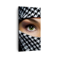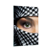 Quadro su vetro - Gli occhi verdi di una donna sono nascosti dietro un tessuto a fantasia in bianco e nero. - 70x100cm - Ritratto di bellezza velata con gli occhi verdi - Decorazione murale moderna per soggiorno e camera da letto ARTTOR