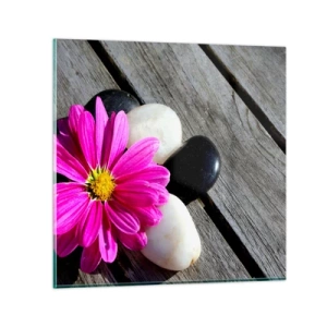 Orologio da parete - Orologio in Vetro - Un fiore rosa su uno sfondo di pietre e una base di legno. - 30x30cm - Riposo sul molo - Decorazione murale moderna per soggiorno, cucina e camera da letto ARTTOR