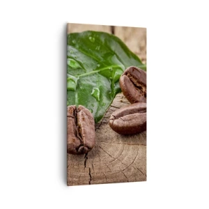 Quadro su vetro - Chicchi di caffè e foglia verde su uno sfondo di legno - 70x100cm - Nero e autentico - Decorazione murale moderna per soggiorno e camera da letto ARTTOR