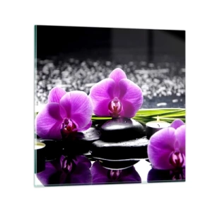 Quadro su vetro - Orchidee viola su uno sfondo di pietre e candele in un ambiente rilassante - 70x100cm - Annegare nel silenzio e nella pace - Decorazione murale moderna per soggiorno e camera da letto ARTTOR