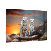 Quadro su vetro - Tigri bianche contro il sole al tramonto - 100x70cm - Proprio come a Narnia - Decorazione murale moderna per soggiorno e camera da letto ARTTOR