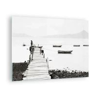 Quadro su vetro - Vista in bianco e nero di un molo di legno su un lago - 70x50cm - Sull'acqua silenziosa e pura - Decorazione murale moderna per soggiorno e camera da letto ARTTOR