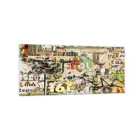 Quadro su vetro - Un collage di frammenti di giornali e manifesti in stile artistico. - 120x50cm - Qualcosa sta succedendo… - Decorazione murale moderna per soggiorno e camera da letto ARTTOR