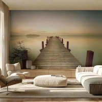 Fotomurali Premium Sand - Aurora, alba, luce - Paesaggio, Lago, Ponte di Legno - 300x210 cm