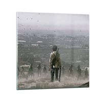 Orologio da parete - Orologio in Vetro - Una figura con una pistola è in piedi di fronte a un gruppo in un paesaggio distopico. - 30x30cm - L'ultimo dei giusti? - Decorazione murale moderna per soggiorno e camera da letto ARTTOR