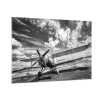 Quadro su vetro - Foto in bianco e nero di un biplano classico - 100x70cm - Non vedo l'ora! - Decorazione murale moderna per soggiorno e camera da letto ARTTOR
