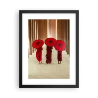 Quadro su tela - Stampe su Tela - Tre monaci con ombrelli rossi nell'architettura tradizionale - 120x80cm - In cammino verso la Terra Pura - Decorazione murale moderna per soggiorno e camera da letto ARTTOR