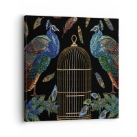 Orologio da parete - Orologio in Vetro - Pavoni colorati accanto a una gabbia dorata su sfondo nero - 30x30cm - Con gli abiti reali - Decorazione murale moderna per soggiorno, cucina e camera da letto ARTTOR