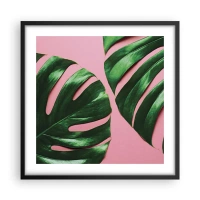 Quadro su vetro - Foglie di monstera verdi su sfondo rosa - 100x70cm - Appuntamento in verde - Decorazione murale moderna per soggiorno e camera da letto ARTTOR