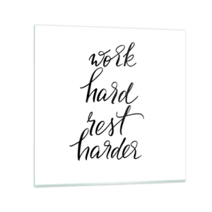 Orologio da parete - Orologio in Vetro - Scritta in bianco e nero "lavora duro, riposa di più" su sfondo bianco - 30x30cm - L'equilibrio della vita - Decorazione murale moderna per soggiorno, cucina e camera da letto ARTTOR