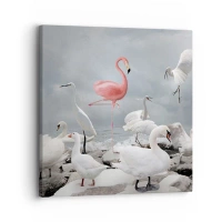 Quadro su tela - Stampe su Tela - Un fenicottero rosa tra cigni bianchi sullo sfondo di un lago - 50x70cm - Come sono arrivato qui? - Decorazione murale moderna per soggiorno e camera da letto ARTTOR