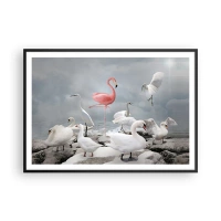 Poster in cornice nera - Un fenicottero rosa tra cigni bianchi sullo sfondo di un lago - 100x70cm - Come sono arrivato qui? - Decorazione murale moderna per soggiorno e camera da letto ARTTOR