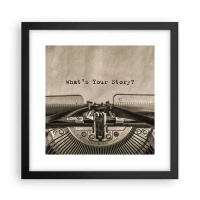 Orologio da parete - Orologio in Vetro - Primo piano di una macchina da scrivere con la scritta "Qual è la tua storia?" - 30x30cm - Rispondimi - Decorazione murale moderna per soggiorno, cucina e camera da letto ARTTOR