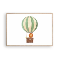 Poster in cornice nera - Un palloncino con un leone sorridente in un cestino color pastello - 100x70cm - I viaggi del leone - Decorazione murale moderna per soggiorno e camera da letto ARTTOR