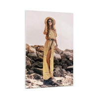 Quadro su vetro - Una donna in stile boho sullo sfondo di una spiaggia rocciosa - 80x120cm - La magia delle pietre - Decorazione murale moderna per soggiorno e camera da letto ARTTOR