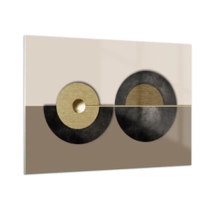Quadro su vetro - Cerchi geometrici in oro e nero su sfondo beige - 100x70cm - Variazioni attorno al cerchio - Decorazione murale moderna per soggiorno e camera da letto ARTTOR