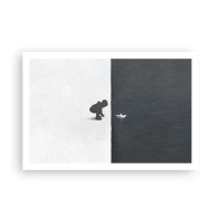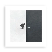 Poster - La figura di un bambino con una barchetta di carta su uno sfondo di metà contrastanti - 100x70cm - La grande spedizione - Decorazione murale moderna per soggiorno e camera da letto ARTTOR