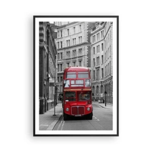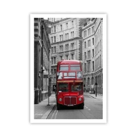 Quadro su vetro - Un autobus rosso sullo sfondo di edifici cittadini bianchi e neri. - 70x100cm - Il quotidiano non deve essere grigio - Decorazione murale moderna per soggiorno e camera da letto ARTTOR