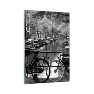 Quadro su vetro - Canale con biciclette in fotografia in bianco e nero - 80x120cm - Vista molto olandese - Decorazione murale moderna per soggiorno e camera da letto ARTTOR