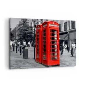 Quadro su tela - Stampe su Tela - Cabine telefoniche rosse su uno sfondo urbano bianco e nero. - 120x80cm - Cabine telefoniche rosse - Decorazione murale moderna per soggiorno e camera da letto ARTTOR