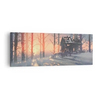 Quadro su tela - Stampe su Tela - Una casetta nel bosco in un paesaggio invernale con i raggi del sole al tramonto - 140x50cm - Qui solamente il sole osserva - Decorazione murale moderna per soggiorno e camera da letto ARTTOR