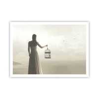 Poster - Una donna con una gabbia contro un cielo calmo - 100x70cm - Sii libera - Decorazione murale moderna per soggiorno e camera da letto ARTTOR