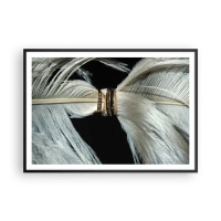 Poster in cornice nera - Una piuma bianca con due anelli d'oro su uno sfondo nero - 100x70cm - ...e non ti lascerò... - Decorazione murale moderna per soggiorno e camera da letto ARTTOR