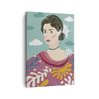 Poster in cornice nera - Ritratto di una donna con un abito colorato e stilizzato su uno sfondo di nuvole. - 50x70cm - Con la malinconia nello sguardo - Decorazione murale moderna per soggiorno e camera da letto ARTTOR