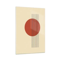 Quadro su vetro - Cerchio rosso astratto con linee su sfondo beige. - 80x120cm - Nel cerchio e oltre - Decorazione murale moderna per soggiorno e camera da letto ARTTOR
