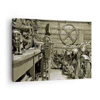 Quadro su tela - Stampe su Tela - Officina retrò con motociclette e attrezzi - 70x50cm - Nel capanno di zio Alfredo - Decorazione murale moderna per soggiorno e camera da letto ARTTOR