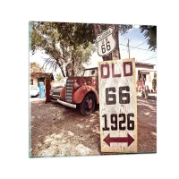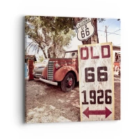 Quadro su tela - Stampe su Tela - Auto retrò e cartello della Route 66 in un ambiente rustico - 70x100cm - La leggenda della provincia americana - Decorazione murale moderna per soggiorno e camera da letto ARTTOR
