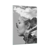 Quadro su vetro - Una composizione in bianco e nero con la silhouette di una donna e un paesaggio montano. - 80x120cm - Ritratto montano nuvoloso - Decorazione murale moderna per soggiorno e camera da letto ARTTOR