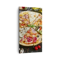 Quadro su vetro - Pizza in vari gusti con uno sfondo di condimenti - 80x120cm - Ventaglio di gusti - Decorazione murale moderna per soggiorno e camera da letto ARTTOR