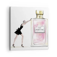 Quadro su tela - Stampe su Tela - Una donna in abito nero accanto a una bottiglia di profumo - 70x100cm - L'essenza della femminilità - Decorazione murale moderna per soggiorno e camera da letto ARTTOR